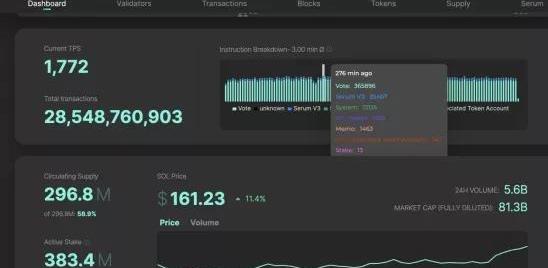 截止发稿前,Solana网络数据情况如下:验证节点:1060区块高度:97,090,014SOL流动总量:296,700,000TPS:1,772交易总笔数:28,548,760,903
