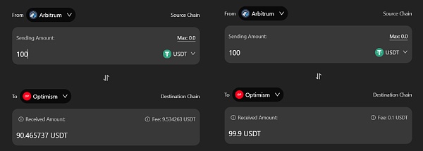 上图中我们可以看到Hop收取了一部分手续费,Arbitrum上100 USDT可以置换Optimism上98.9USDT,其中的价差含需要支付给LP提供流动性的报酬。除此之外还需要交额外的2.25USDT的手续费,其中包括支付给bonder的1 USDT和交易成本1.25 USDT。交易成本会随着Layer1的gas fee波动。用户最终将在Optimism上收到96.7 USDT,远比用原生桥便宜并且快捷得多。
