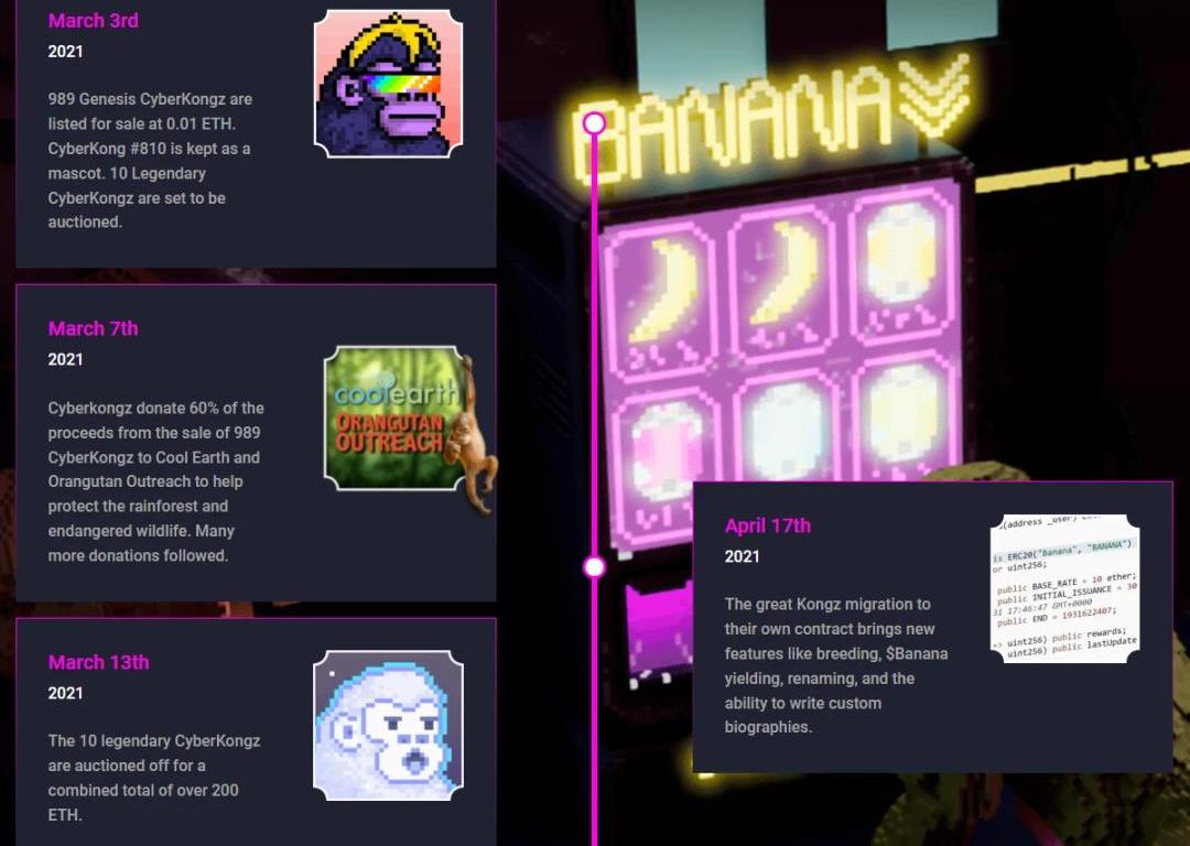根据官网简介,CyberKongz是由艺术家myoo在2021年3月初创建的1000个独特的猿猴系列NFT,价格大多为0.01ETH。随后通过社交媒体的病式传播开始爆火。随着时间的推移,以及CyberKongz社区的壮大,社区中一些在NFT和De-Fi领域最优秀的开发者和专家,开始尝试提供他们的技能和时间来发展社区。在很短的时间内,$BANANA代币被创造出来,使GenesisCyberKongz有能力在未来十年内每天产生10个BANANA代币,而GenesisCyberKongz的持有者可以通过销毁BANANA代币用于更改他们的CyberKongz特征,如独特的名字和传记,拥有2个以上GenesisCyberKongz则可以销毁600枚BANANA用于培育和孵化4000个随机产生的具有不同特征和稀有性的BabyCyberKongz。此外,BANANA代币可以用来购买CyberKongzVX头像的定制设备和可穿戴物品,最终将用于未来的元宇宙项目中。CyberKongz的算稳“梯云纵”模式