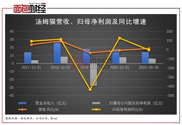 图3:2017年至2021年前三季度汤姆猫营收、归母净利润及同比增速