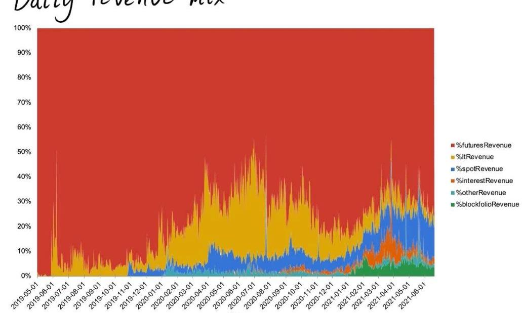 收入组合这些收入来自哪里?与其他交易所一样,FTX的收入来源包括合约交易的手续费、现货交易的手续费以及利息。我们可以看到,随着时间的推移,该公司已经成功实现了收入的多样化,例如,现货收入不断增长。甚至最近买入的Blockfolio似乎也带来了收入,鉴于其并不高的交易量,这当然超出了大家之前的预期。“其他”收入则包括NFT销售等占比更小的部分。