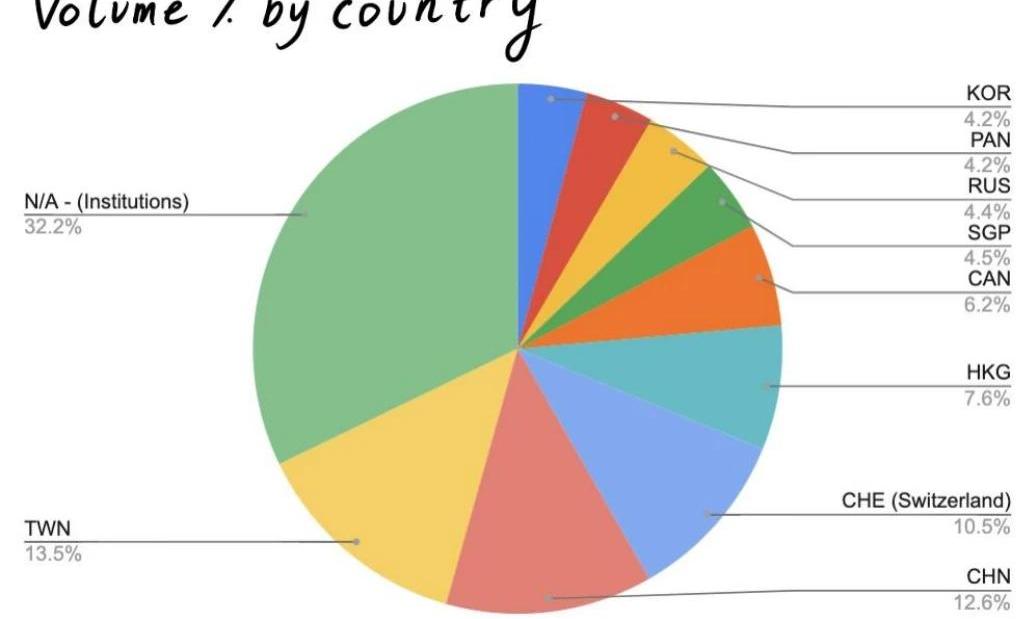 在按交易量进行分析时,这些份额发生了变化。大多数交易量来自于机构,FTX并没有将其划归到每个国家。但除此之外,大多数交易来自中国,其次是和香港。这一细分表明,FTX的能量基础确实在亚洲,新加坡和韩国也在其中。