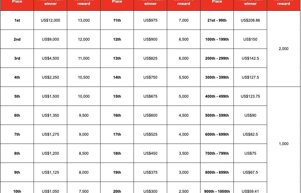 REVVRacingTOWER杯前1000名的玩家奖金池高达15万美元,包含TOWER代币、REVV代币和用于《疯狂塔防物语》游戏的宝石道具。其中奖金的三分之一以TOWER代币支付,三分之二以REVV代币支付: