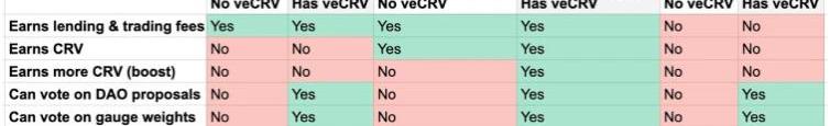 CRV锁定兑换veCRV的比例,来源:https://curve.fi/usecrv关于veCRV有另外两个机制值得注意:1.veCRV不能转账;2.随着锁定的CRV逐渐逼近到期时间,veCRV的数量会线性衰减。CRV\\veCRV对于持币者的价值包括——●获得平台的交易手续费:用户将CRV代币质押锁定后,凭借质押的veCRV的数量获得全平台大部分交易池的手续费分成,分成的比率为总手续费的50%,而分成通过3CRV代币发放。●流动性做市的收益加速:流动性提供者在锁定CRV之后,可以通过Boost功能来提高自己的做市所获得的CRV奖励收益,进而提高自己做市的整体APR,Boost所需的CRV由所在池和LP的资金量决定。●协议治理:Curve的治理同样需要通过veCRV来实现,治理的范围除了协议的参数修改,还包括Curve的新增流动性池投票,以及CRV的流动性激励在各个交易池之间的权重分配等等。CRV、veCRV对于整体协议的价值捕获相当充分,不仅能获得协议的手续费分成和加速做市收益,其在治理上的作用也非常巨大,这就为CRV创造了巨大的需求和稳定买盘。而在Curve的系统之外,用户锁定CRV获得veCRV,还能获得其他Curve支持与合作的项目代币的持续空投。比如在BSC上的DEX项目Ellipsis会空投其代币EPS总量的25%给veCRV用户,基于Curve的流动性和CRV质押管理平台Convex的代币CVX也将空投总量1%给veCRV用户。建立在波卡上的货币市场协议Equilibrium也有空投的可能性。CRV代币的核心需求方与大部分项目代币“重现金流捕获,轻功能性”不同,CRV代币除了有现金流捕获能力之外,在Curve系统中也有极强的功能性,重点体现为对于治理权的控制。在同一梯队的头部Defi中,Curve的治理参与度、提案数量和质量,都是业内顶级的,被不少人誉为“DAO治理的典范”。之所以如此,是因为Curve的治理权拥有比其它Defi更高的价值和稀缺性,会引来大量机构级用户的争夺。第一个关键问题:CRV代币所对应的平台治理权的核心价值是什么?1.上币的裁判权:平台通行卡正如前文一节所说,Curve与Uniswap、Pancakeswap等通用性现货交易平台不同,它主要聚焦于服务“稳定对价资产”的交易,这类资产无论是像Terra发行的UST、火币发行的HUSD这样的稳定币,还是像stETH这样Lido提供的ETH质押凭证,它们都有极强的“锚定需求”。稳定对价资产与普通项目方的代币不同,项目代币可以涨涨跌跌,交易深度的需求也是适中即可;而项目方发行的稳定对价资产如果波动剧烈,深度不足,那就意味着项目的根基动摇,业务必将衰败。所以项目方必须要想办法为自己发行的稳定对价资产找一个深度最佳,稳定效果最好的地方来做市,满足巨额交易之下依旧保持低滑点的交易需求,目前拥有这个能力几乎只有Curve。与谁都可以在Uniswap提供流动性不同,用户如果想要进入Curve的核心流动性池,必须通过社区投票满足条件:30%以上的veCRV投票参与度,51%以上的支持率。随着CRV的流通总量越来越大,这个门槛也会越来越高。