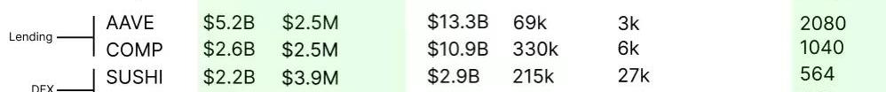 从最简单的分析开始,我们可能会比较协议中锁定的总价值(TVL)与代币市值的比率。虽然仅TVL不足以衡量协议的采用、效率和未来价值,但它可以成为了解中短期价格行为的有用指标。许多人追踪TVL走向,因此它对价格和注意力有一种反射性影响。它还为我们提供了添加到协议中的流动性和产品市场契合度的高级指标。在价值探索的过程中,我们可以看到,例如Compound或Yearn,相对于代币的价格表现,最近超过了协议TVL。另一方面,Sushi是一个相反的例子,即TVL的增长保持相对平稳,TVL增长保持相对平稳,而疲软的价格表现反映了这一点。