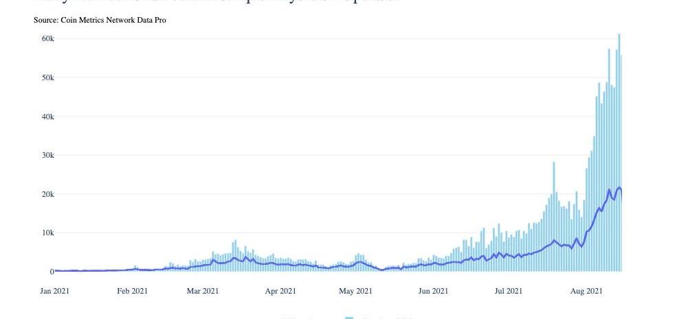 在过去两周之内,NFT销售量激增,远远超过了3月份的NFT热潮。最大的NFT平台OpenSea的销售额在上周达到每天超过6万笔的峰值,接近3月份峰值的8倍。8月份交易量已超过10亿美元,每日独立买家的数量也创下了历史新高。