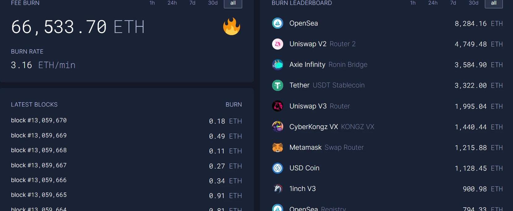 自以太坊EIP1559引入基础手续费燃烧机制之后,已有超过66500枚ETH被销毁。在对销毁贡献最大的应用中,OpenSea、AxieInfinity、CyberKongzVX等NFT相关应用合计销毁了1.4万枚以上的ETH,对ETH价格起到了提振作用。