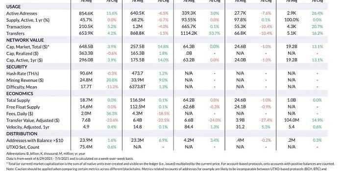 上图资料来源:CoinMetricsNetworkDataPro我们发现,比特币活跃地址周环比增长了11.6%,但与此同时,以太坊活跃地址却下降6.5%。在上周短暂超过比特币之后,以太坊活跃地址数量没有增加太多每日活跃地址,现在反而被比特币再次超越。由于区块之间的平均时间飙升,上周比特币的使用量有所下降,这导致添加到区块链的比特币区块比平时少。区块时间的增加可能是由于网络算力下降导致,这可能会使开采的区块数量减少。6月27日,比特币全网算力跌至2019年以来的最低水平后,但从上周开始,算力似乎开始逐渐趋稳。以太坊和比特币网络亮点