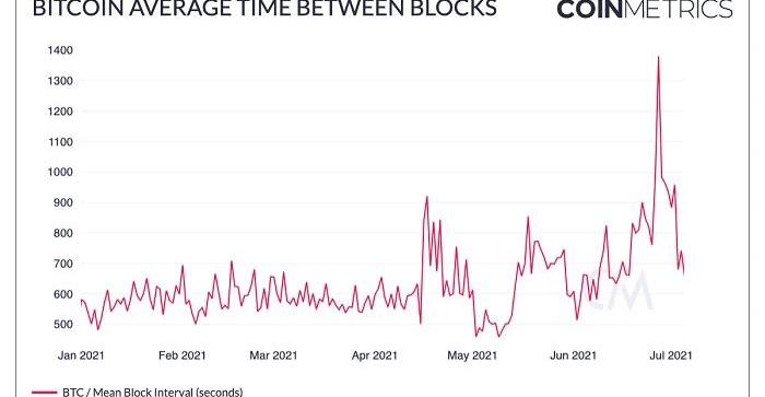 上图资料来源:CoinMetricsNetwork数据图表上周,比特币区块间隔时间一度超过23分钟,创下自2010年以来的最高水平,之后比特币网络进行了挖矿难度调整。比特币的平均出块时间之所以会在6月份有所增加,可能是由于四川等省叫停比特币挖矿引发矿工不断迁出中国所导致。自比特币挖矿难度调整以来,网络平均出块时间已降至约658秒,这与初始10分钟的出块时间目标已经非常相近了。