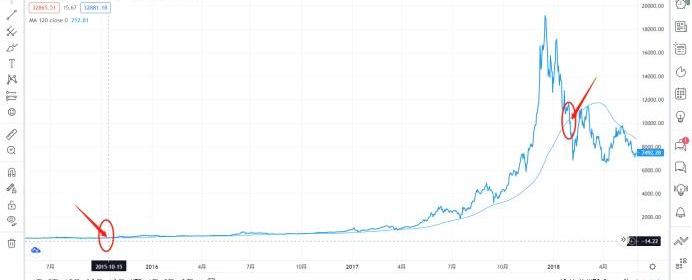 这次牛市,原本是从2019年3月启动,标志信号是BTC价格突破3800美元,站上120日均线。然而期间发生“312”黑天鹅事件打乱了这一节奏。2020年4月,BTC价格突破8000美元,站上120日均线。此后才算正式宣告进入牛市。2021年5月,BTC价格跌破5万美元,失守120日均线。期间历时1年,涨幅6倍。