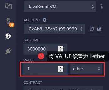 在部署合约成功后在VALUE设置框中填写5,将单位改成ether,点击deposit存入5个以太币。
