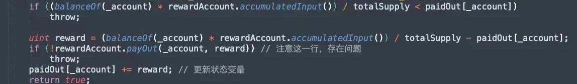 下面的代码则是进行提款奖励操作,每次攻击者调用这项功能时p.splitData都是一样的,并且p.splitData.totalSupply与balances的值由于函数顺序问题,发生在了转账操作之后,并没有被更新。