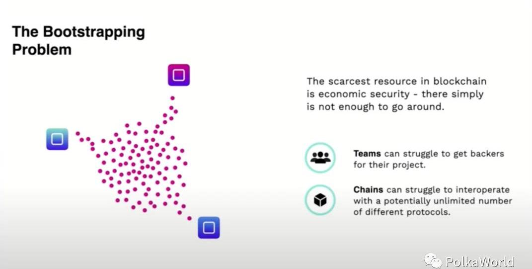 目前的区块链社区还并不算大,而每一个Layer1的区块链其实都在从同一个池子里去薅人,来建立支持系统,为自己争取支持者。每个项目都要招募节点运营者,来保证其区块链的安全性。而且这些链本身必须艰难地去和已有的,甚至是未来会出现的区块链系统去交互。这些问题很难解决。共享安全而波卡通过给所有平行链提供共享安全来解决这个资源问题。也就是波卡自身会激励并收集验证人节点,这些验证人会被分配给不同的平行链来验证其状态转换。