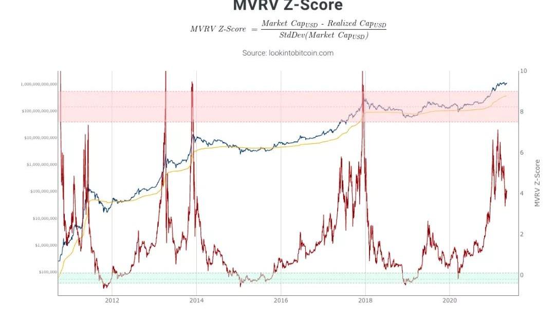将新开采的比特币的每日价值与每日发行价值的365天移动平均值进行比较。极端的读数表明市场周期达到顶峰。Puell倍数将新开采的比特币的价格与给定时间内所有开采的比特币的平均市场价值进行比较。当Puell倍数较高时,矿工往往会大量抛售比特币。MVRVZ得分