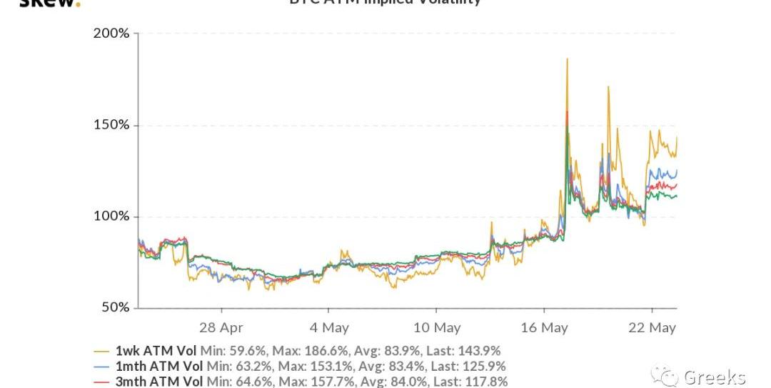 播报数据由Greeks.live和Skew.com提供。随着本轮持续性暴跌的推进,比特币的市值占比重回47%,这说明其他币种跌得更惨。今天的市场盘面十分弱势,很多市值排名很高的热门币下跌了20%甚至更多。数字货币市场是一个联动的整体,一荣俱荣,一损俱损。期权成交量3.2亿美元,期权持仓量为64亿美元。10d157%30d111%90d85%1Y72%各标准化期限隐含波动率:今日:1m124%,3m117%,6m112%,DVol140%5/22:1m123%,3m118%,6m112%,DVol140%比特币成交量下降明显,在今年各种币纷纷暴涨的过程中,BTC的市值占比一度从74%下降到39%,但是随着本轮的暴跌,BTC的市值占比回到了47%。比特币今天承受下行压力仍然较大,IV维持昨日水平,但是一旦来了行情,以目前脆弱的市场很难维持现状。