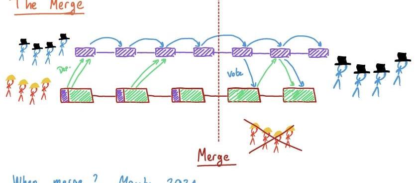 图:当前以太坊(eth1链)的运作方式用户想要做一些事情(“进行交易”),因此将其交易发送给矿工,矿工把它们打包成块并添加至一条不断增长的链中。矿工运行PoW共识机制,以决定谁来添加下一个区块,并执行区块中的交易,以确保交易是有效的。
