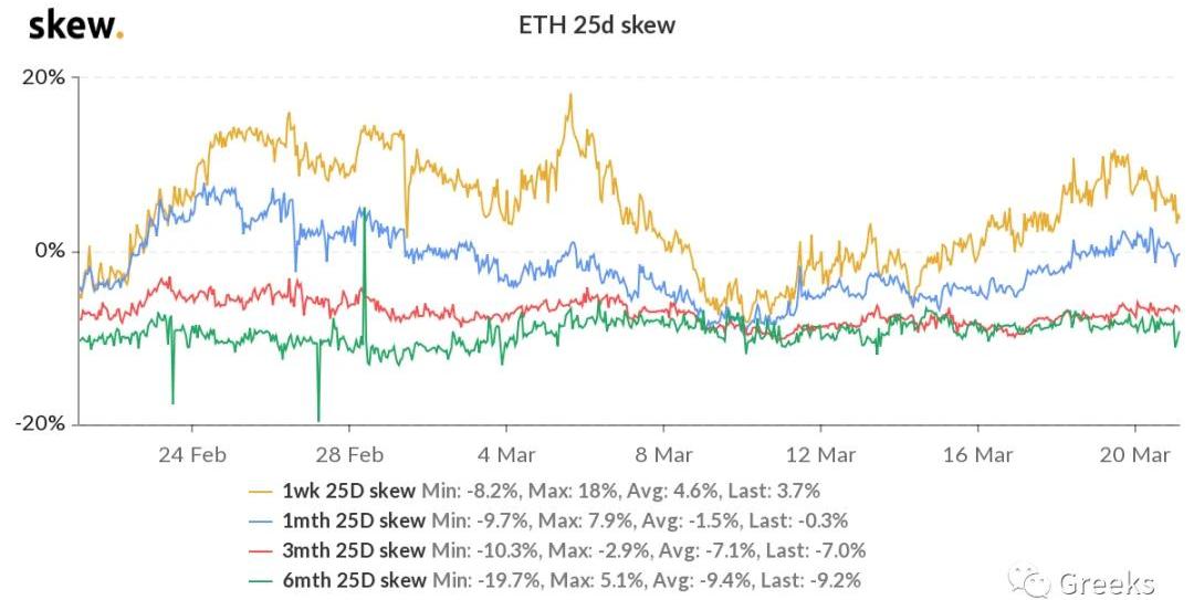 ETH历史波动率10d70%30d96%90d121%1Y92%以太坊今日期权成交量0.59亿美元,持仓量26亿美元。各标准化期限IV:今日:1m99%,3m109%,6m112%3/20:1m98%,3m109%,6m113%以太坊各期限IV与昨天接近,周末一般没有什么行情。以太坊的Put/CallRatio下降至本月低点,一般每月月初会比较低,因为Put的持仓都以短期为主,而今年的行情又恰好都从月初开始启动。