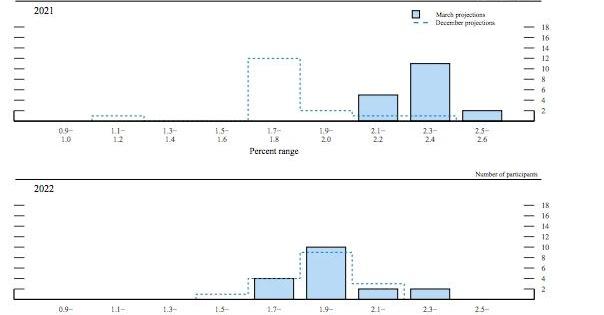 联邦公开市场委员会在周三的政策声明中表示:“在复苏步伐放缓之后,经济活动和就业指标最近有所回升,然而受疫情影响最严重的行业依然疲软。通货膨胀率继续低于2%。”大规模的财政支持和疫苗接种的扩大将有助于经济重新开放,这提振了投资者对利率上升和通货膨胀的预期。投资者担心经济的全面开放将导致消费者价格通胀率飙升,这反过来又将迫使美联储加快加息步伐。大部分联邦公开市场委员会委员表示不会在2023年之前加息。根据美联储周三发布的季度经济预测,18位美联储官员中,7人预计到2023年年底前利率将上升,上次会议中17位委员里只有5人抱此看法,这表明认为美联储会比同僚预期更早收紧货币政策的人数有所增加。官员们仍然乐观地认为,通货膨胀将是短暂的。根据预测,剔除食品和能源后,今年的通货膨胀率预计将达到2.2%,2022年将降至2%。