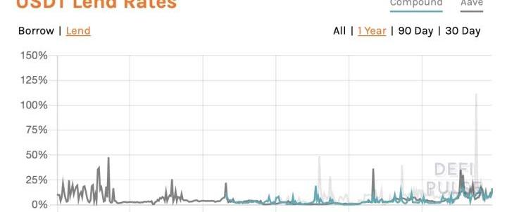 图源:DeFiPulse反观像Compound以及Aave这种去中心化借贷平台中USDT的借贷年化利率,在年初时最高峰达到接近年化50%,且波动剧烈。虽然从此处我们可以看出链上资产的使用成本要远超链下资产,然而去中心化借贷平台由于流动性不稳定以及其他因素影响,并不能看清稳定币借贷利率的全貌。更具代表性的利率指标应该是加密机构间的拆借利率。加密机构间拆借利率机构间拆借利率是指机构间的短期资金借贷利率,也是整个市场中的最具有代表性的核心利率,它能够及时、灵活、精准地反映整个市场内短期的资金供需关系。当机构拆借利率持续上升时,反映短时间内对资金需求的继续攀升,预示市场中流动性或将下降,也可侧面反映市场内杠杆率的增加。在加密世界中的机构间拆借利率是指类似于中心化借贷机构、提供借贷服务的中心化交易所以及提供借贷服务的其他机构间的短期借贷利率。据贝宝金融数据统计,在2020年初加密机构间借贷利率与LIBOR及去中心化借贷平台的利率走势相似,在二月至三月间达到顶峰,随后下降至4月底部。在疯狂的2月期间,用户甚至在交易所中借不到USDT去做到,某些交易所利率达到年化36%。随着市场回暖利率也重新回到正常水平。