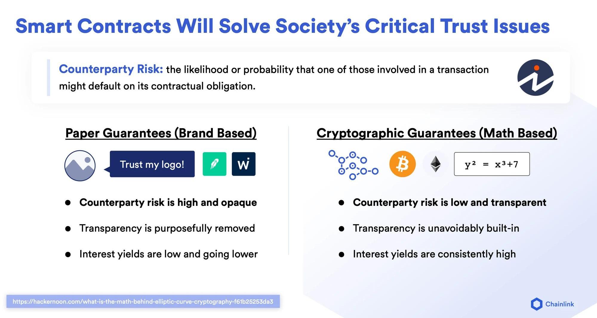 如今,大多数人与传统机构之间的协议都是建立在品牌信誉度之上的,签署协议即意味着你必须信任机构会为了维护其品牌声誉而履行合约义务。基于品牌声誉的协议一直存在对手方风险,即交易中一方有可能无法履行合约义务。而现在出现了一种基于算法的新型合约,我们称之为“智能合约”。智能合约采用加密技术和无法篡改的代码逻辑,根据合约预先设置的参数自动交割。这种基于算法的协议本质上无须一方对另一方产生信任,也就是说,交易方不必盲目信任对手方会履行合约义务,因为合约将严格按照预设条款执行。大型组织往往会基于品牌声誉签署协议,如果违约不会影响他们品牌的长期声誉,那么他们就有可能会为了谋取私利而这么做。大机构违约,普通老百姓往往束手无策,因为要跟这些大机构打官司不仅劳民伤财,而且非常低效。现在有了算法型协议,普通人可以在金融交易的每个环节实现公开透明和自动执行。这对新兴市场来说尤其意义重大,因为那些市场监管规范不够成熟,因此大机构更有可能违约。RealVision近期发布了一期播客,主题为“预言机以及区块链功能的扩展”,其中Chainlink的联合创始人SergeyNazarov谈到了品牌背书合约以及算法型合约。本文节选了Sergey的访谈内容,重点聚焦区块链和Chainlink预言机将如何降低对手方风险并打造出公平、透明且高效的数字协议。品牌背书合约存在哪些问题?