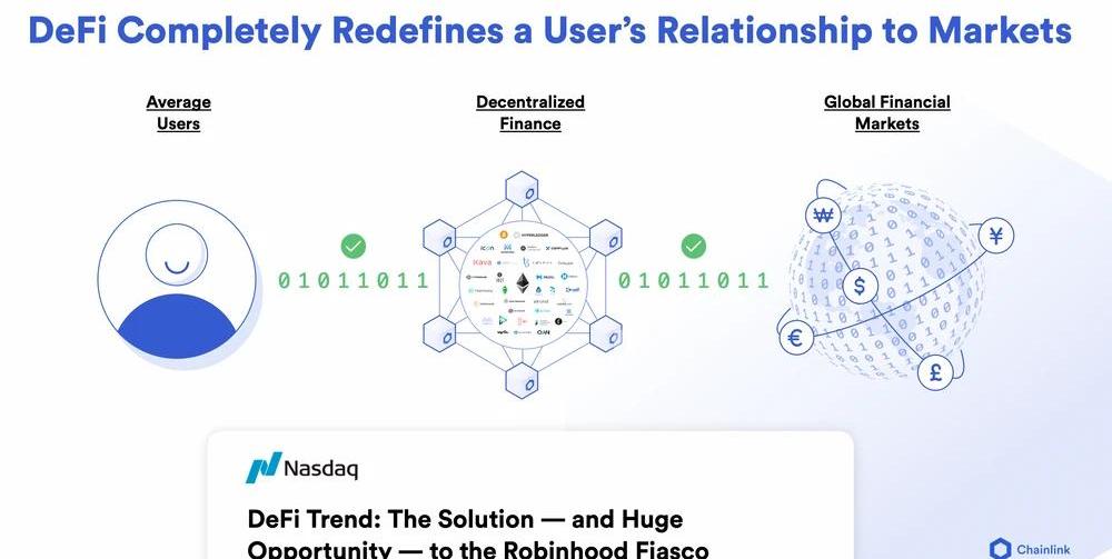 因此我认为,随着金融系统的底层问题不断浮出水面,算法型协议的价值将受到越来越多人的认可。随着DeFi应用中智能合约的透明性逐渐被大家看到,其应用规模会不断扩大。所以从用户的角度来看,智能合约其实就是基于算法的合约协议。说得更技术一点,就是用一段代码表示一项资产,或资产所有权,或一个金融产品。总之,这段代码会在计算机系统中运行,并不受任何一方的控制,价值持有者也无法干预代码执行。任何人都无法阻止用户清算或控制自己的资产,这就是它独一无二的地方。合约协议、金融产品和所有权都变成了一行行代码。现在有许多优秀的开发者将这些代码组合在一起,并创建出了一个生态,而Chainlink也在这生态中。当智能合约生态出现后,就会激活金融产品和金融资产的创新,这就跟当年互联网企业的创新热潮一样。这些互联网企业将单独的代码组合在一起,并创造出全新的功能,这引爆了一轮互联网创新浪潮,并催生出了电商、Uber等各种创新应用。因此,一方面智能合约系统将让人们有能力应对对手方风险。另一方面,还会催生出全新的生态,在其中人们可以灵活组合各种智能合约模块,打造出创新的金融产品。就像当年互联网企业开发web应用一样,我们也要打造出与web应用同样快速且好用的金融产品。