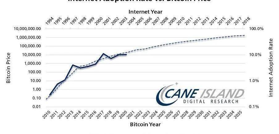 虽然互联网发展的时间较长,其采用比率也非常抢眼,但比特币和区块链底层技术的表现似乎更加出色。在它刚刚崛起的初期,比特币的增长速度比90年代初的互联网发展还要快,目前预计在未来四年内将达至10亿左右的用户量。有趣的是,由以下CaneIslandDigitalResearch所制作的图表可见,互联网的应用率似乎与比特币的价格有着非常相似的轨迹。