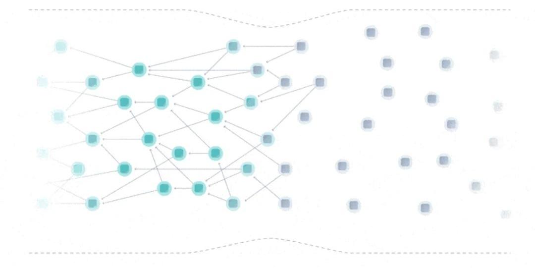 Dfinity的共识确认过程,有并行效果的是左侧签名部分IOTA对算法的修改比较彻底,对比区块链,IOTA使用Tangle数据结构形成总帐本Tangle特点是每个事务都附加到两个先前的事务里,所以要完全消除了原有区块链链式结构对确认时间的依赖。这就形成了交易的无限关联确认结构,可以达到并行效果。