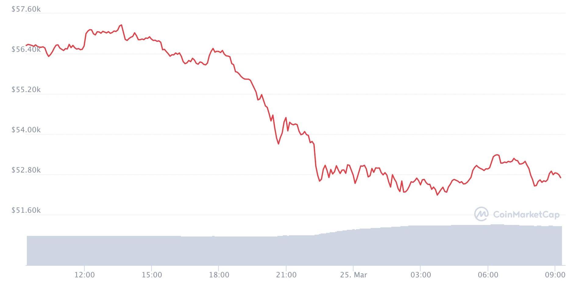 3月25日消息,CoinMarketCap的数据显示,BTC从昨日晚间开始大幅下跌,24小时内,币价从最高57262.38美元下跌至最低52129.25美元,“跳水”5133美元,跌幅达到9.85%左右。