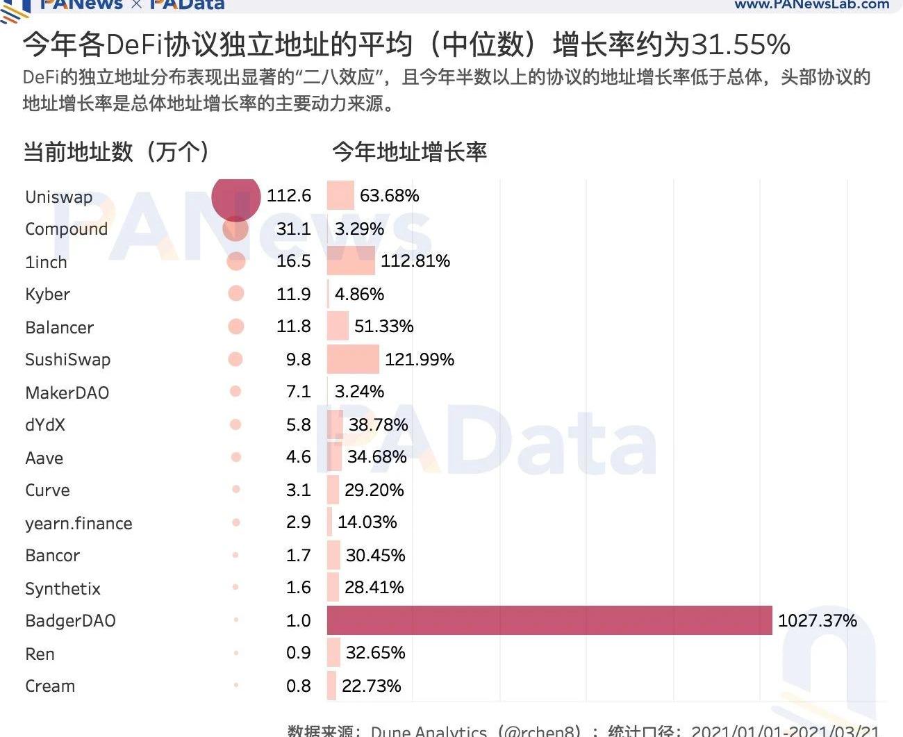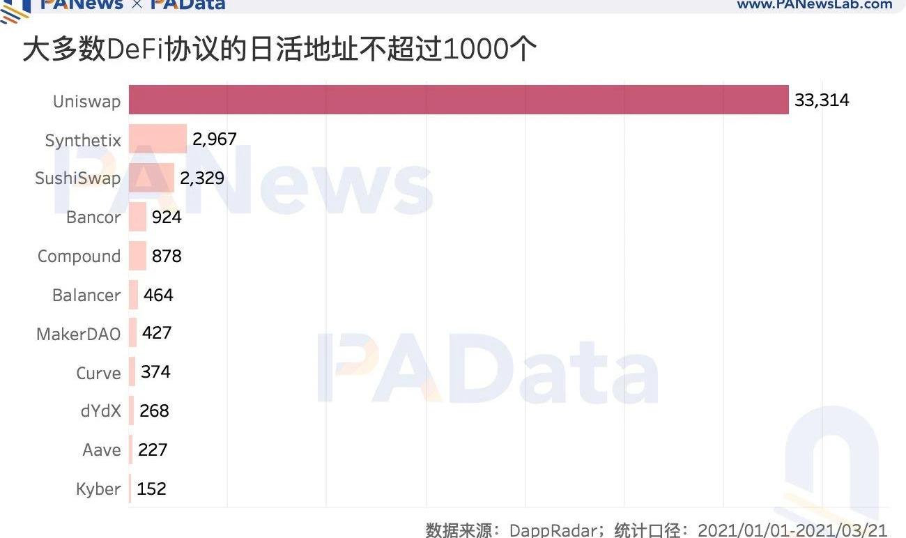 今年各DeFi协议独立地址的平均增长率约为31.55%,低于整体42.08%的涨幅。其中,仅BadgerDAO、SushiSwap、1inch、Uniswap和Balancer的独立地址涨幅超过了整体水平,尤其是BadgerDAO,涨幅超过了1027%,SushiSwap和1inch也都超过了100%,这三个应用的涨幅较高。可见,头部协议的地址增长率是总独立地址增长率的主要动力来源。而且,根据DappRadar的数据,目前绝大多数DeFi协议的日活跃地址都很低。今年日活地址最多的Uniswap也仅3.33万个,这与移动互联网主流应用动辄上亿的日活还存在非常显著的量级差异。但应该看到各DeFi协议日活地址的快速增长潜能。