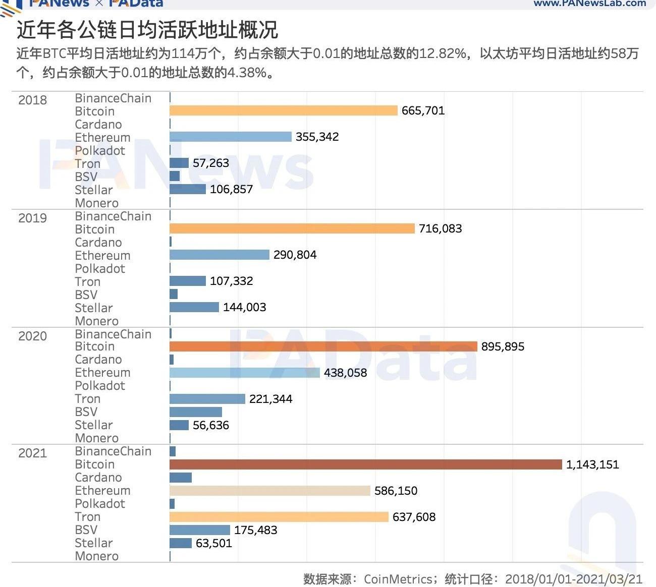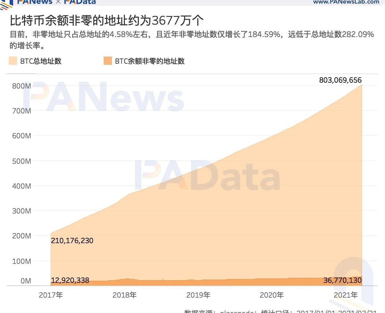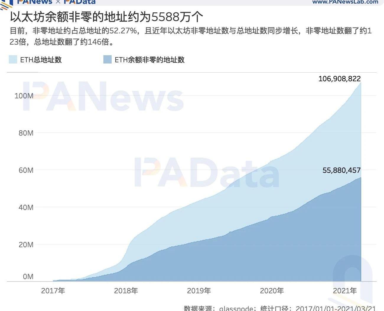 比特币和以太坊是区块链中最具代表性的两条公链,了解这两条公链的有效地址数是预测区块链用户规模的基础。根据glassnode的统计,截至3月21日,比特币共有8.03亿个地址,较2017年初增长了282.09%。但并不是所有地址都是有效地址,其中不少地址的余额已经为0,这部分地址或因注册后从未使用,或因无法支付手续费等原因基本不可能再与比特币发生交互,是“沉默”地址。
