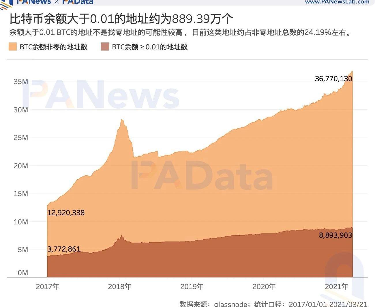 数据显示,目前比特币余额非零的地址数大约为3677万个,较2017年初的增幅约为184.59%,低于总地址数的增幅。考虑到比特币采用的特殊的UTXO模型,这些余额非零的地址中可能存在大量找零地址。找零地址同样可能因为无法支付交易手续费而成为“沉默”地址。一般认为,余额大于0.01的地址为非“沉默”地址的可能性较高,因此,这部分地址也被认为有效地址,即未来仍可能发生链上交互行为的地址。根据统计,目前比特币上余额大于0.01的地址数约为889.39万个,约占非零地址数的24.19%。