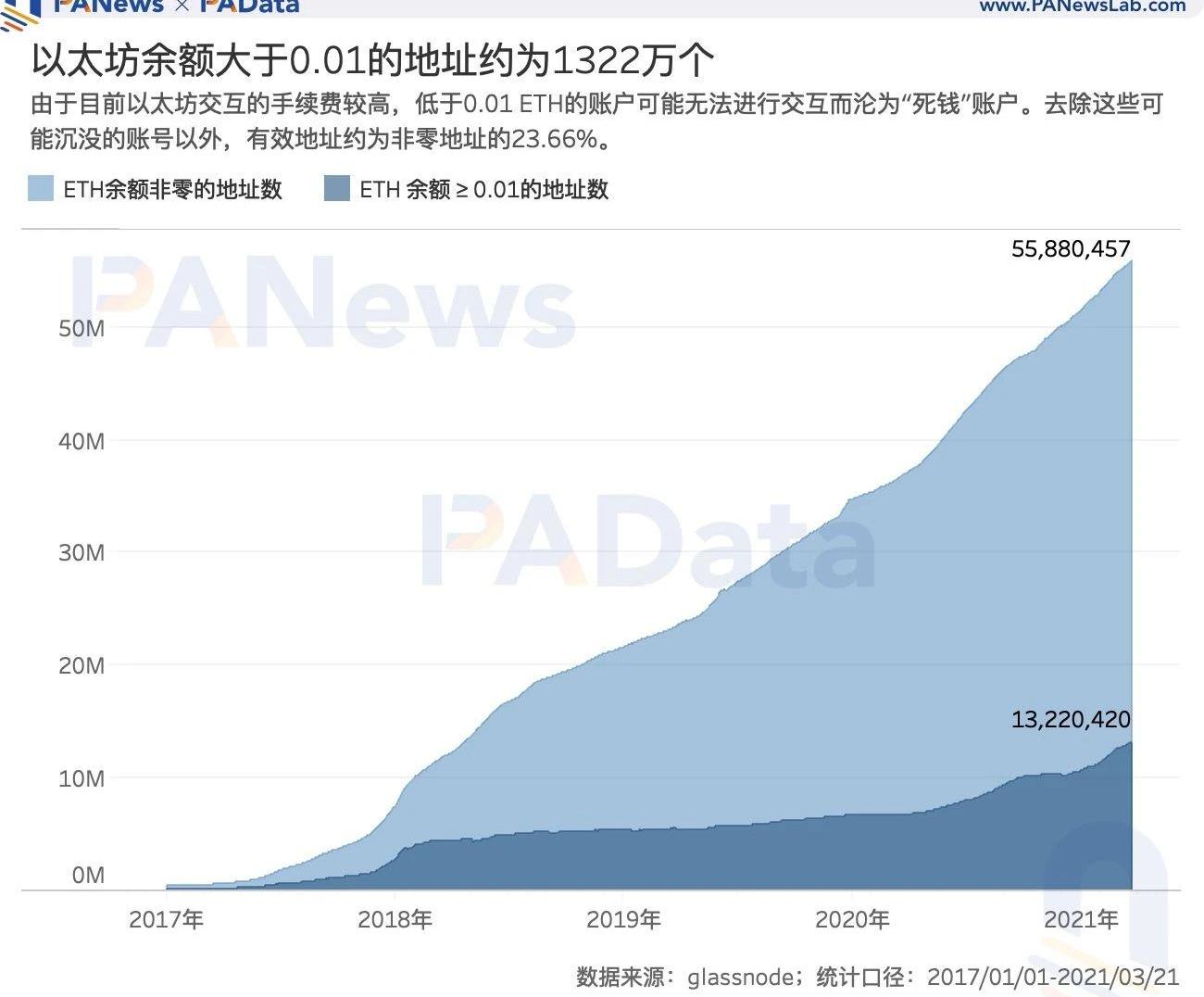 再看以太坊,根据glassnode的统计,截至3月21日,以太坊共有超1.06亿个地址,较2017年初翻了约146倍。与比特币一样,余额为0的地址或是新注册未使用的地址,或是使用后刚好归零的地址,总之这些地址再与以太坊发生交互的可能性非常低,可以视为“沉默”地址。目前,以太坊上余额非零的地址总数约为5588万个,约占总地址数的52.27%,相较2017年翻了123倍。根据BitInfoCharts的统计,近期以太坊上的平均交易手续费大约为0.01ETH,因此,余额低于0.01ETH的地址也可被视为“沉默”地址。