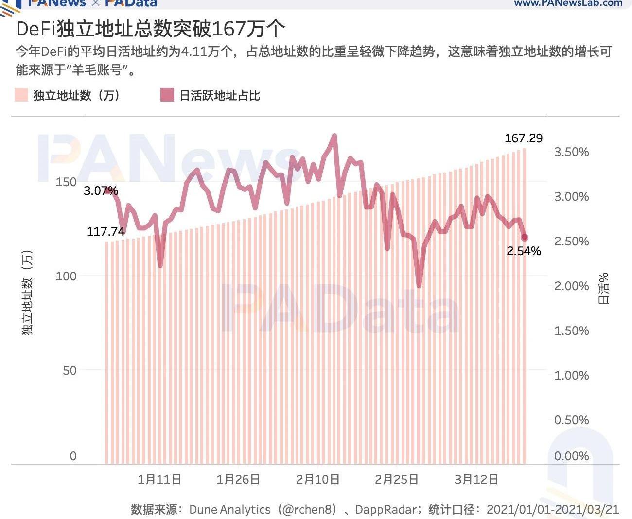 去年底,DeFi的独立地址数量就突破了100万个,较去年年初翻了10倍。这种高速增长趋势仍然在持续。根据DuneAnalytics的统计,截至3月21日,DeFi的独立地址数已经达到了167.29万个,较今年年初的117.74万个增长了约42.08%。
