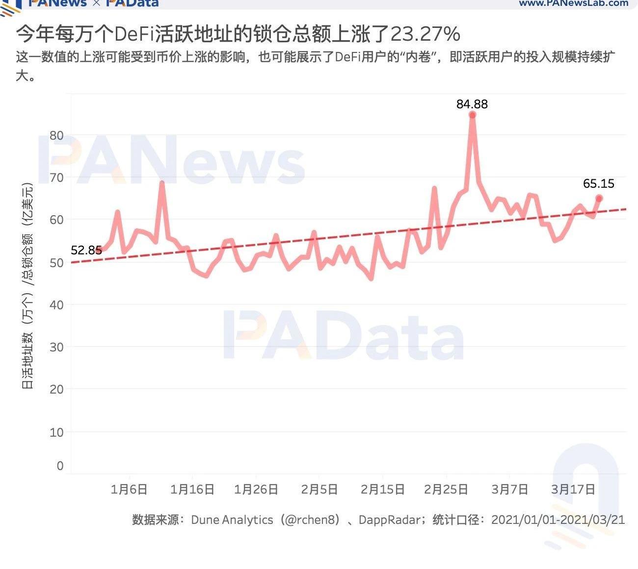 另一方面,根据DappRadar对DeFi活跃地址数量的监测,截至3月21日,活跃地址的数量约为4.25万个,较今年年初的3.61万个整体增长了约17.73%,低于总独立地址涨幅。而且,日活地址占当日总地址数的比重也从3.07%下跌至2.54%,这意味着大多数新增独立地址为“羊毛地址”的可能性比较大。假设按照比特币活跃地址占有效地址总数的比例折算,那么DeFi的有效地址数预计大约为33.15万个,同样假设5个地址对应1个独立用户,那么DeFi的独立用户预计约为6.63万人。值得注意的是,今年以来,每万个活跃地址的锁仓总额呈明显上升趋势。年初,每万个活跃地址的锁仓总额约为52.85亿美元,而3月21日,这一数字已经上涨至65.15亿美元,涨幅达到23.27%。这可能受到币价上涨的影响,也可能展示了DeFi用户的“内卷”,即活跃用户的投入规模持续扩大。