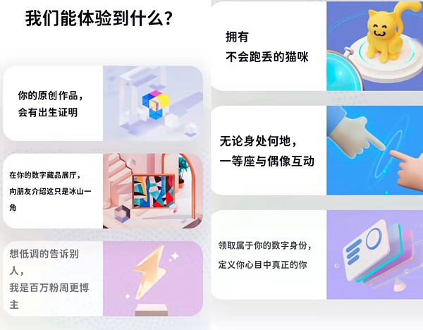 其二,则是打造NFT藏品展厅,能够向他人展示自己的NFT藏品。类似于阿里的蚂蚁链NFT和腾讯的幻核。
