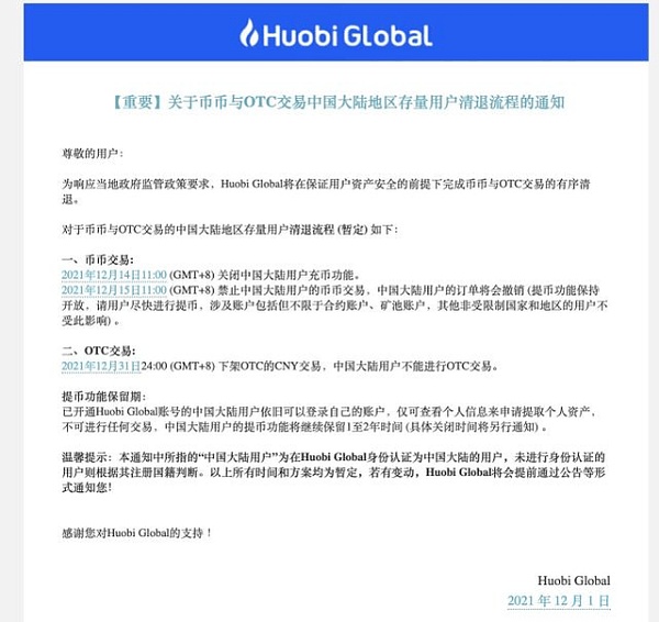 值得关注的是,近日,加密货币交易平台火币开始发布站内信提醒用户清退账户资产,明确将于12月14日关闭用户的充币功能。12月15日禁止用户的币币交易功能,12月31日,将下架OTC交易。