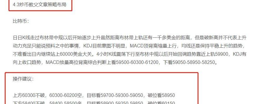 因为NFT的特殊性我是相信它可以为数字资产产权保护做出贡献的,但是目前看来的话想要从一个概念走向应用NFT还是有很长的路要走,你看懂了吗?4.4炒币教父行情策略布局比特币:四小时级别图中,布林带开口向下,行情在布林带的下轨边缘运行,现位于57637点位;各均线均下行,币价在其下方波动,空方势力更为强劲一些,后期行情会尝试着回到五日均线上方波动,一旦企稳会继续向上试探,那便是多单进场的最佳时机;附图中,MACD呈现死叉状态,RSI和Stoch均保持着平缓的姿态运行着;由此可见短期走势多以震荡运行为主。操作建议:1.企稳57700点位后进场多单,目标看到58500,防守点位看到57500;2.若企稳58500点位后继续跟进多单,目标看到59200,防守点位看到58300。