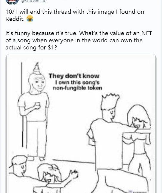 李启威在Twitter上展示了上面这幅画,他觉得这幅画十分形象,因为它反映了真实情况,世界上每个人都可以花1美元下载一首歌曲,然后享受美好的音乐,但一首歌的NFT又有什么价值呢?2021年已过去近四分之一,NFT似乎每天都在给我们带来惊喜。除了佳士得之外,知名拍卖平台苏富比也开始关注NFT领域发展,该拍卖行首席执行官CharlesStewart3月17日宣布将在下个月拍卖知名艺术家PAK的NFT作品——这至少表明,现在仍有不少人认可NFT有价值,而且愿意为之付出很多钱。