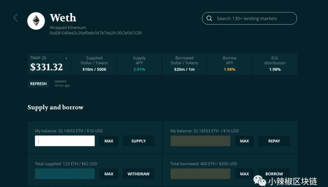 第二张是具体加密货币的借贷和供应界面。可以看到供应的年化、借贷的年化,以及欧拉协议代币EUL系数。