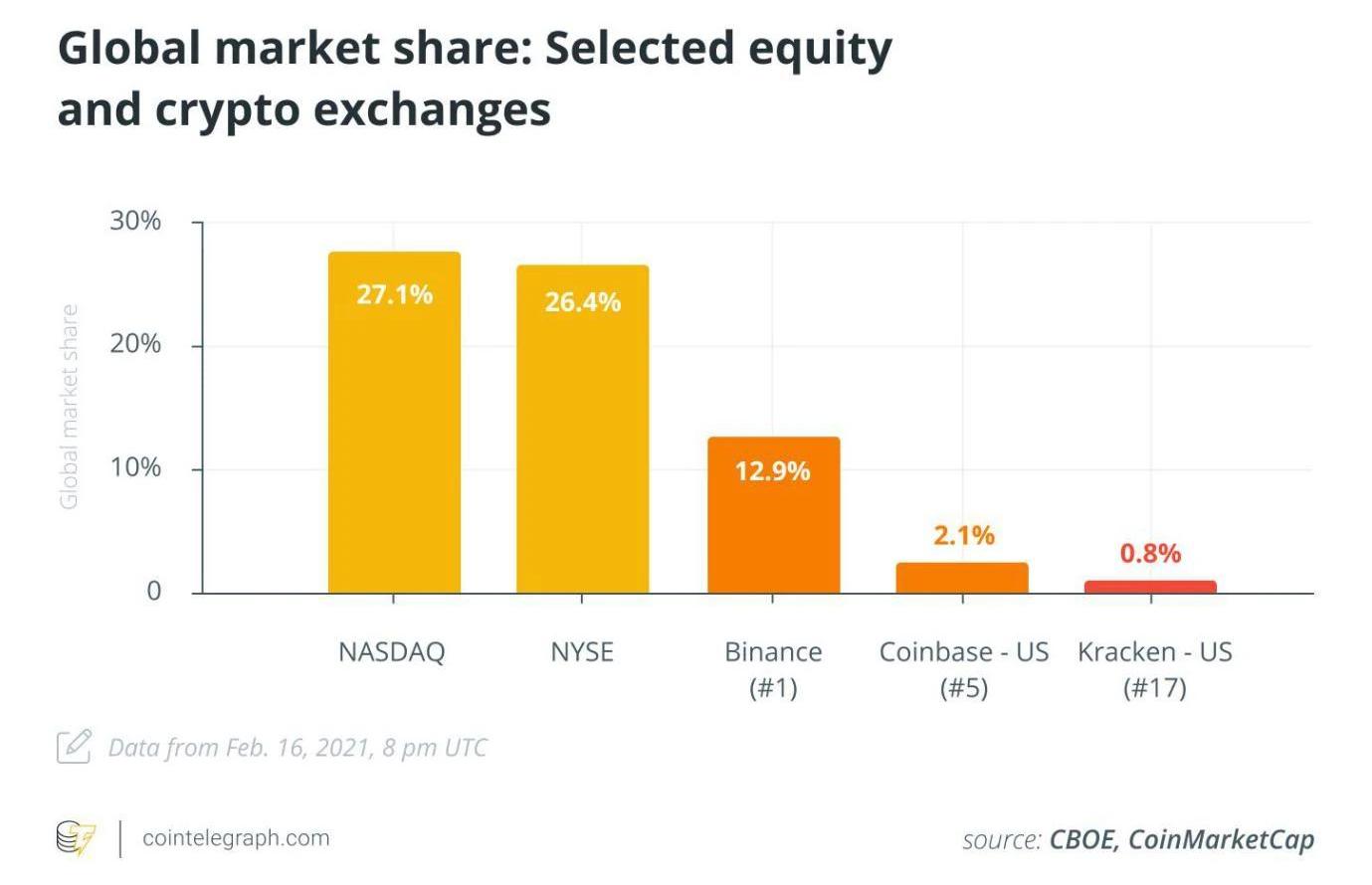 《财富》杂志认为,Coinbase的IPO计划是“加密行业的里程碑事件”。与当年标志着互联网合法性的Netscape的IPO计划一样,Coinbase也向广大公众传递了一则信号:在美国证券交易委员会看来,加密货币交易是合法、合规和安全的。投资者将有机会持有美国最大的加密交易平台的股票。许多人将对Coinbase的投资视为对加密货币交易行业未来的投资。Coinbase是美国交易量最大的加密货币交易所,其交易量是美国第二大交易所的三倍,甚至领先国际水平。但是,加密货币交易市场与传统交易市场的体量仍相差甚远。为了更好的了解加密交易平台市场之间的细微差别,我们最好先来观察一些行业现状。