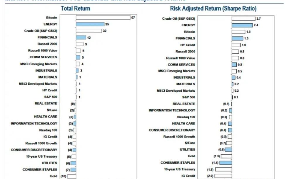 高盛(GoldmanSachs)最新报告显示,截至2021年3月4日,比特币今年的回报率约为70%,大约是紧随其后的能源行业35%的回报率的两倍。此外,该报告图表显示,今年到目前为止,比特币的表现超越了所有主要传统资产类别。