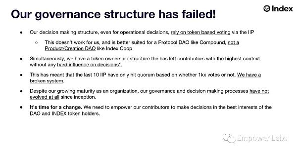 这个跟BanklessDAO没关系,而是发生在一个叫indexcoop的DAO里。这是一个通过社区力量去推动一个产品的DAO,但读者不需要知道和理解indexcoop的产品,。大约几周前,他们发布了一个关于未来规划的PPT,里面触目惊心的写道“我们的治理结构已经失败了”