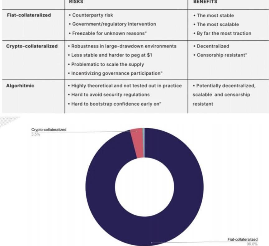 绝大多数稳定币都与法定货币锚定,使用法币作为抵押品,占比达到96%。之所以选择与法币挂钩,主要是因为这种方式最具扩展性,执行过程也非常简单。