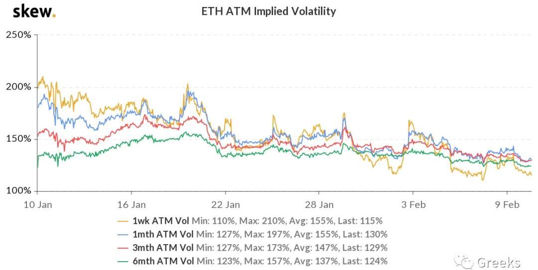 ETH历史波动率10d122%30d147%90d121%1Y113%以太坊今日期权成交量1.35亿美元,持仓量24亿美元。各标准化期限IV:今日:1m130%,3m130%,6m124%2/9:1m136%,3m133%,6m126%以太坊IV变化不大,以太坊超短期期权的IV已经处于近期低位,昨天比特币的暴涨告一段落,按照最近的规律,以太坊不远了。