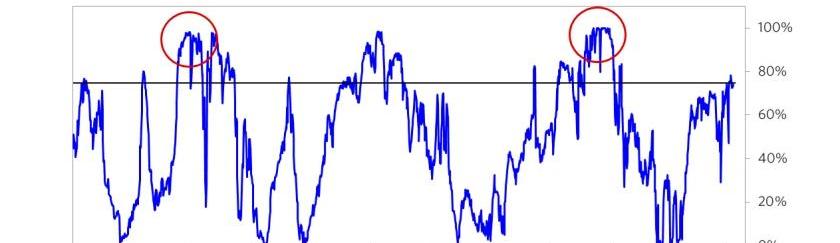 受价格上涨吸引,新股民蜂拥而入,这往往预示着泡沫的出现。这是因为,他们入市通常是因为市场火热,自己本身也不够成熟。在1929年和2000年的美股泡沫时期,尽皆如此。由于新的散户投资者涌入最受欢迎的股票,这一指标近来已经来到第95个百分位。从其他指标来看,这似乎也处于泡沫之中。乐观情绪有多普遍?
