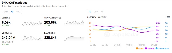 数据来源:https://dappradar.com/binance-smart-chain/games/dnaxcat
