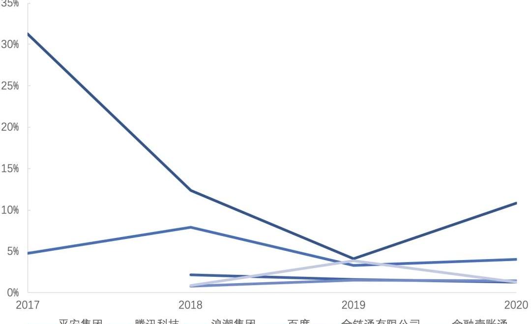 数据来源:零壹智库这种情况也同样体现在头部企业当中。以微众银行、腾讯科技、平安集团为例。从2018-2020年,所申请的区块链金融专利占比均处于下降趋势。其中,下降幅度最大的是平安集团。微众银行在2020年申请了214件区块链专利,其中区块链金融有33件,占比为15%。而2018年该占比为33%,下降了18个百分点。腾讯科技在2020年申请了721件区块链专利,其中区块链金融有88件,占比为12%。而2018年该占比为22%,下降了10个百分点。平安集团在2020年申请了992件区块链专利,其中区块链金融有73件,占比为7%。而2018年该占比为33%,下降了26个百分点。图8:2017-2020年微众银行、腾讯科技和平安集团区块链金融专利申请情况