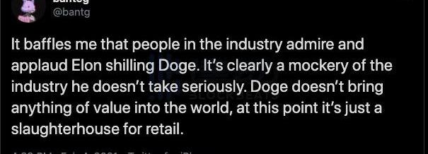 作为yEearn的核心开发,@banteg也对马斯克的行为表示迷惑不解,并表示:我十分不解为何加密领域的人们会为马斯克喊单狗狗币而叫好呢?马斯克简直是在拿加密世界开玩笑!狗狗币并没有为这个世界增添任何价值,现在他就是散户的屠宰场!!