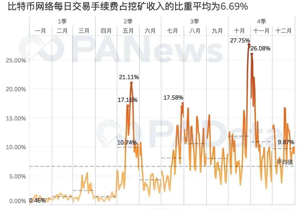 全年日均挖矿收入约为1311BTC,按照每日币价折算,相当于1369.39万美元。全年变化趋势同样以第三次减产为分界线,在第三次减产前,日均挖矿收入约为1862.42BTC,折合1514.21万美元,第三次减产后,日均挖矿收入约为1003.04BTC,折合1289.17万美元,币本位和美元本位分别较减产前下跌4.37%和14.86%。值得注意的是,12月美元本位计价下的日均挖矿收入约为2232.33万美元,为全年最高,当月的平均币价约为21983美元。另外,11月美元本位计价下的日均挖矿收入约为1736.48万美元,与减产前2月的日均挖矿收入相当,当月的平均币价约为16646美元。这意味着,按照当前的网络状态,只有当币价高于16000美元时,日均挖矿收入才可能与减产前相当。受到交易手续费大幅增长的影响,链上交易手续费占挖矿收入的比重也从去年的平均2.8%扩大至今年的平均6.69%,增长近4个百分点。尤其是第三次减产后,日均手续费占收入的比重从减产前的1.78%暴涨至9.42%。手续费占比超过20%的共有11天,其中,10月29日、10月30日、10月31日、10月28日和11月2日这5天的手续费占比都超过25%。
