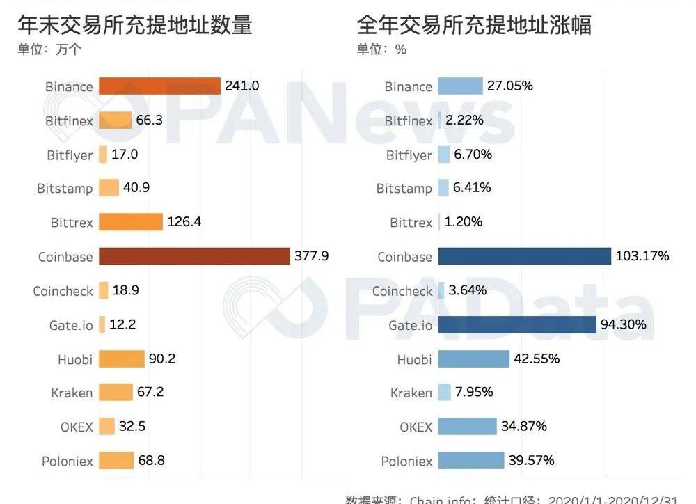但是,从交易所全年BTC净流入量来看,今年监测范围内的12家交易所累计流出约35.37万BTC。在各大交易所中,OKEx、Poloniex、Binance和Coincheck的余额呈净流入状态,其中。OKEx净流入量最多,达到了15.32万BTC。其余8家交易所的余额都呈净流出状态,其中Huobi和Bitfinex净流出量较多,都超过了10万BTC。交易所的充提地址数量在一定程度上与用户的数量成正比,充提地址数量越多意味着用户数量越多的可能性也越高。从各交易所全年充提地址的数量变化来看,今年参与BTC交易的用户数量有所增长,其中Coinbase和Gate.io的充提地址数量增长最多,分别达到了103.17%和94.30%。另外,Huobi、Poloniex、OKEx和Binance的充提地址也增长了25%以上。